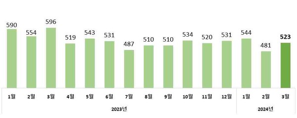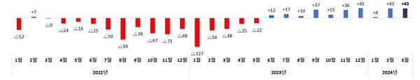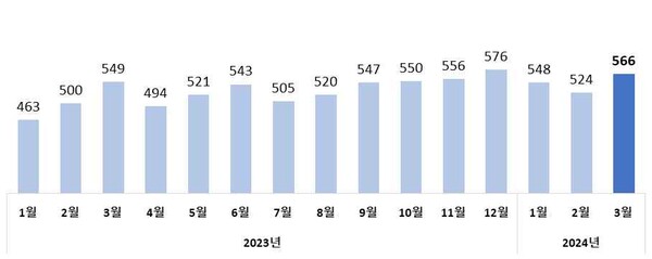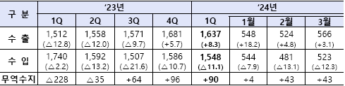 한편, 2024년 1분기 수출은 전년 동기(1,512억 달러) 대비 +8.3% 증가한 1,637억 달러를 기록했다. 월평균 수출은 546억 달러를 기록하며 역대 1분기 수출액 중 2위를 기록했다.