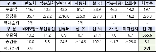 최대 품목인 반도체 수출은 309.9억 달러(+50.7%) 기록, 2023년 1분기 이후 수출 증가흐름이 지속되며 역대 2위 실적을 기록했다. 자동차 수출은 175.4억 달러(+2.7%)로 역대 1위 실적을 기록했다.