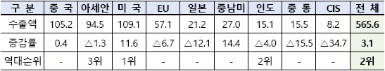 對美 수출은 자동차‧기계 등 주력품목 호조세로 8개월 연속 증가했다. 對中 전체 수출은 조업일 부족(△1.5일)에도 반도체 호조세 등으로 증가, 조업일을 고려한 일평균 수출 또한 4개월 연속 플러스기조를 유지하였다. 對중남미 수출은 기계‧차부품 등 중심으로 3개월 연속 수출 플러스를 기록했다.