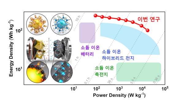 연구팀은 개발된 음극과 양극을 완전셀로 구성해 고성능 하이브리드 소듐이온 에너지 저장 소자를 구현했다. 하이브리드 소듐이온 에너지 저장 소자는 기존 상용화된 리튬이온 배터리를 뛰어넘는 에너지 밀도와 축전기의 출력 밀도 특성을 모두 가지는 것을 확인했다.