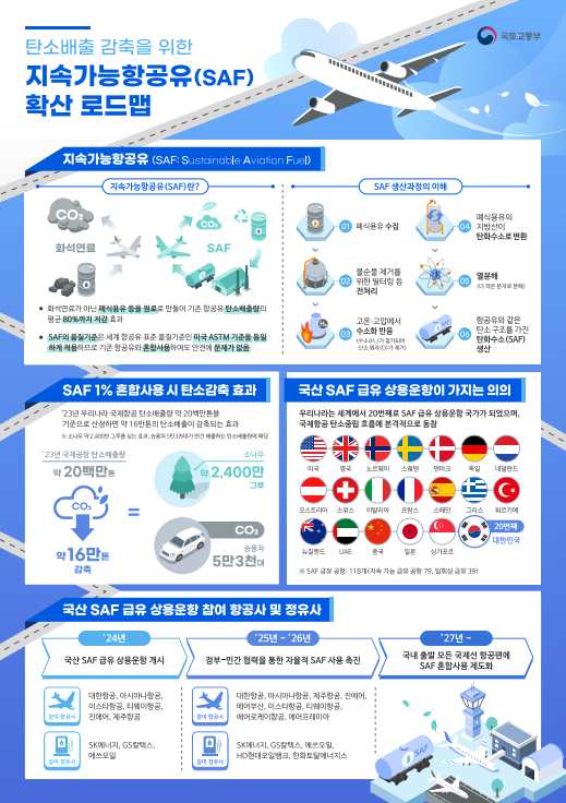 박상우 국토부 장관은 “기후위기 대응과 항공산업의 지속가능한 성장을 위해 국제항공 탄소감축의 핵심수단인 지속가능항공유(SAF) 사용은 더 이상 선택이 아닌 필수”라면서 “이번 정책 발표와 국산 SAF 급유 첫 상용운항을 시작으로 국제항공 탈탄소 정책을 적극 추진하여 우리나라가 항공분야 탄소중립 선도국가로서의 위상을 확립해 나가도록 노력할 것”이라고 밝혔다.