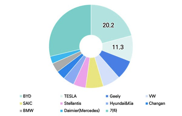 2023년 글로벌 전기차 판매량 1,370만 대 중 중국이 820만 대를 판매하며 1위를 기록했다. 중국의 대표 전기차 기업인 비야디(比亞迪, BYD)는 2024년 1~4월 86만 7천 대를 인도하며 글로벌 점유율 20.2%로 압도적인 1위를 차지했다.