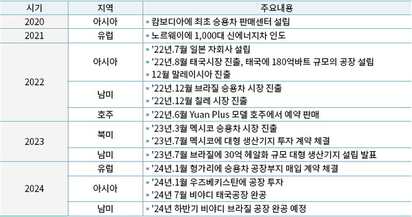 비야디는 동남아 최대의 자동차 생산거점인 태국을 겨냥해 Seal, 아토3, Dolphin 등 4종 모델을 연달아 출시하고, 올해 7월부터 연 15만 대 생산이 가능한 라용(Rayong) 공장을 본격 가동하고 있다. 올 하반기에도 브라질 전기차 공장 완공에 이어 헝가리, 우즈베키스탄, 파키스탄 등으로 해외거점을 확대 중인 상황이다.