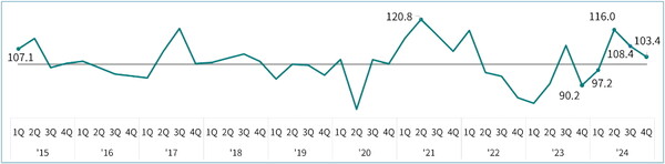 [기계신문] 한국무역협회(KITA) 국제무역통상연구원이 최근 발표한 ‘2024년 4/4분기 수출산업경기전망지수 조사(EBSI)’ 보고서에 따르면, 4분기 EBSI는 103.4로 3분기 연속 100을 상회, 올해 말까지 수출 호조의 긍정적 흐름이 유지될 전망이다.