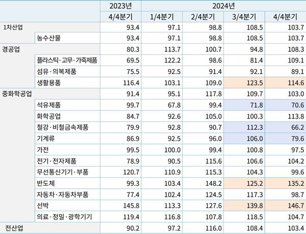 환경 규제에 따른 선박 교체 수요 증가와 기존 수주 물량 인도 확대로 인해 선박(146.7) 수출 호조에 대한 기대가 가장 크게 나타났다. 반도체(135.2)는 AI 관련 반도체 매출 확대 및 기존 IT 품목 수요의 견고한 증가 영향으로 수출 여건이 개선될 것으로 나타났다.