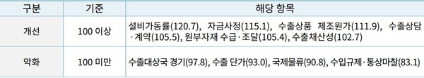 항목별로는 10개 조사 항목 중 ‘설비가동률(120.7)’, ‘수출상품 제조원가(111.9)’ 등 6개 항목에서 수출 여건이 나아질 것으로 조사됐다.