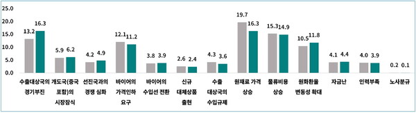 ‘수출대상국의 경기부진(16.3%)’, ‘원재료 가격 상승(16.3%)’이 수출 업체의 가장 큰 어려움인 것으로 나타났다. 특히 미국 제조업·고용 지표 악화로 인해 경기부진에 대한 우려는 지난 분기 대비 증가(+3.1%p)한 반면, 국제 원자재 가격 하락으로 원자재비 부담은 다소 완화(-3.4%p)될 것으로 조사됐다.