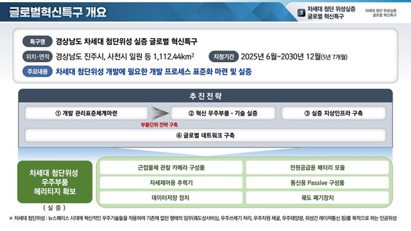 경남 차세대 첨단위성 실증 글로벌 혁신특구는 위성체‧발사체 제조시장과 민간위성 개발사업 수요 확대에 대응하기 위해 진주시와 사천시를 거점지역으로 지정하고, 경상국립대학교를 총괄 주관기관으로 선정했다.