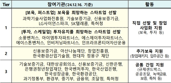 아울러 Tier1 기관에서 선정된 스타트업은 규제특례, 공공조달, 녹색금융, 보증, 멘토링·네트워킹, IP통합솔루션 등 맞춤형 지원의 대상이 되어 사업을 성장시켜 나가는 과정에서 필요한 다양한 지원을 받을 수 있다.