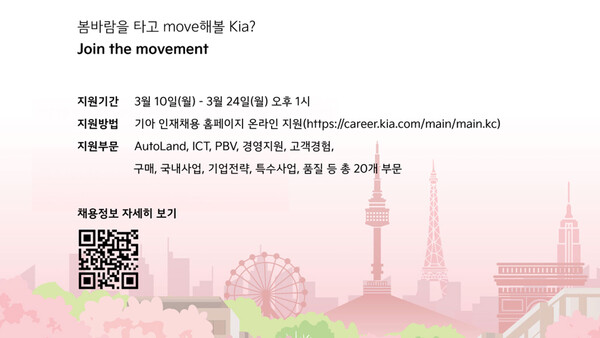 기아 관계자는 “급변하는 모빌리티 환경에서 혁신을 주도할 수 있는 우수 인재 확보가 무엇보다 중요해졌다”며 “기아의 미래 비전을 함께 실현해나갈 도전적이고 역량 있는 인재들의 많은 관심과 지원을 바란다”고 말했다.