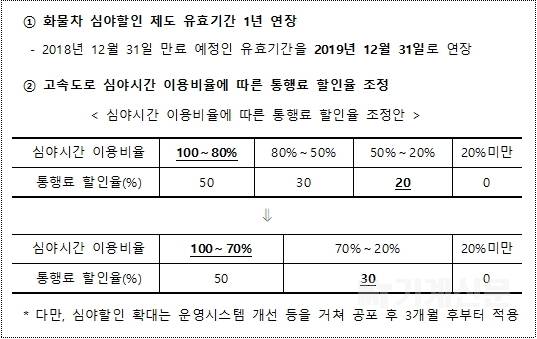 화물차 통행료 심야할인 제도는 영세한 화물업계를 지원하고, 화물 교통량 심야 분산을 통한 고속도로 이용효율 증대를 위해 지난 2000년부터 도입한 제도로, 심야할인 제도 시행 이후 2017년까지 총 2억 9,812만대의 차량이 8,654억 원의 할인 혜택을 받아 왔다.
