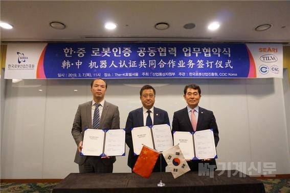 [기계신문] 한국로봇산업진흥원은 상하이전기과학연구소(SEARI), 중국검험인증그룹코리아컴퍼니(CCIC Korea)와 지난 7일 서울 더케이호텔에서 한‧중 로봇관련 표준‧인증 상호협력 및 시험기관간 네트워크 구축을 위한 업무협약을 체결했다고 밝혔다.