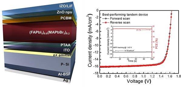 윗부분에는 고효율 페로브스카이트 태양전지를 쌓았는데, 광학 계산 설계로 최적 효율을 얻는 구조로 만들었다. 그 결과 개발된 저비용·고효율 탠덤 태양전지의 효율은 21.19% 효율로 동일 탠덤 구조에서 세계 최고 기록을 확보했다.
