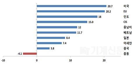 지역별로도 10대 주요지역 중 중동을 제외한 모든 지역에서 수출이 증가하여 지역별로도 고른 성장세를 나타냈다. 경기 부진 등에 따라 전체 수출이 감소세인 對中 수출은 3.8% 증가하고, 미국·EU, 인도·CIS에 대한 수출이 두 자릿수 증가로 선진시장뿐만 아니라 신남방·신북방 지역에서도 뚜렷한 성장세를 나타냈다.