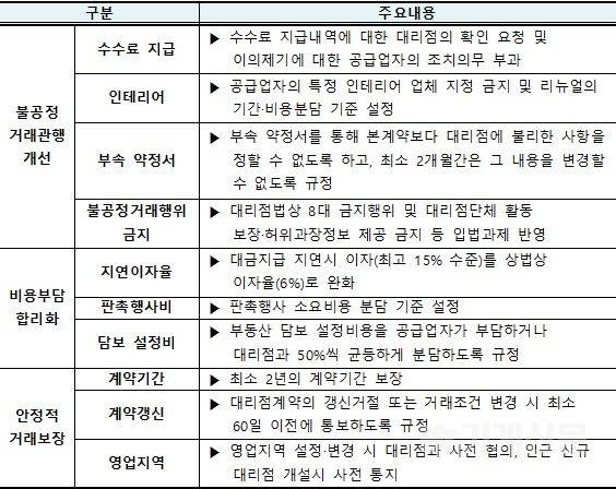 주요 내용를 살펴보면, 불투명한 수수료 내역 공개로 대리점이 피해를 보는 경우를 예방하기 위해, 공급업자로부터 받는 수수료 등의 종류를 명시하고 대리점에게 그 내역에 대한 확인 요청 및 이의제기 권한을 부여하였다.