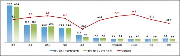 중국(62.6억 달러, △3.0%)은 4월, 5월 증가세를 보였던 대중 수출이 미·중 무역분쟁 심화, 제조업 경기 부진으로 인한 소비경기 둔화 등 영향으로 6월 감소세로 전환하며 2분기 수출이 감소했다.