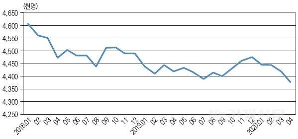 제조업 취업자 수는 전월 대비로 3월의 경우 2만 2천명 감소, 4월의 경우 4만 6천명 감소로 그 폭이 확대되고 있다. 현재, 생산 충격이 큰 만큼 기존의 수주 물량의 소진과 코로나19로 인한 신규 주문 감소가 지속된다면 고용에 대한 영향은 더 뚜렷해질 것으로 예상된다.