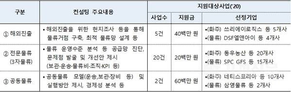 이번 선정된 지원사업 27건은 사업 취지에 따라 화주·물류기업 해외진출 지원 5건, 전문물류(3자물류) 컨설팅 지원 20건, 공동물류 컨설팅 지원 2건이다.