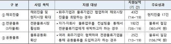 국토교통부는 2008년부터 컨설팅 260건을 지원하여 해외진출 17건 등 가시적 성과를 거두고 있으며, 전문물류(3자·공동) 도입을 통해 497억 원의 비용을 절감한 것으로 평가하고 있다.