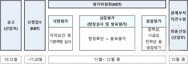 으뜸기업 선정절차는 10월 12일부터 11월 20일까지 총 40일간의 사업공고를 거치고, 서면-심층-종합의 3단계 평가로 구성된다. 10월 14일(수) 온라인 사업설명회를 실시, 녹화영상은 한국산업기술평가관리원 공식 유튜브채널(Oh-keit)에 게시하며 접수마감일까지 시청 가능하다.