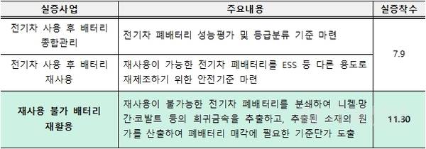 특구의 실증사업도 정상적으로 추진되고 있다. 3개 실증사업 가운데 ‘전기차 사용후 배터리 종합관리 실증’과 ‘전기차 사용 후 배터리 재사용 실증’은 지난 7월 9일 실증에 착수했고, 이번에 ‘재사용 불가 배터리 재활용 실증’까지 본격적인 실증에 들어감에 따라 리사이클링 전 과정에 대한 안전성을 검증하고 경제적인 처리공정과 매각 등에 대한 기준을 제시할 수 있게 됐다.
