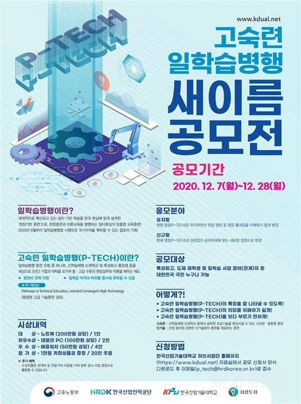 [기계신문] 한국산업인력공단이 12월 7일(월)부터 28일(월)까지 ‘고숙련 일학습병행(P-TECH)’ 사업의 인지도 제고를 위해 새로운 이름을 공모한다.