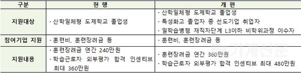 또한, 학습기업에게 지급되는 훈련장려금을 매월 20만원에서 30만원으로, 학습근로자가 외부평가 합격 시 기업에게 지급하는 인센티브도 360만원에서 480만원으로 각각 금액을 올렸다.