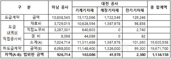 그러나 지에스건설㈜은 ▶하남공사의 경우 자기의 도급내역상 직접공사비 항목의 합계액인 7,024,714천 원보다 926,714천 원 낮은 6,098,000천 원으로, ▶대전공사 중 기계기자재 납품·설치공사의 경우 자기의 도급내역상 직접공사비 항목의 합계액인 11,311,486천 원보다 163,086천 원 낮은 11,148,400천 원으로, ▶계장기자재 납품·설치공사의 경우 자기의 도급내역상 직접공사비 항목의 합계액인 1,367,978천 원보다 41,978천 원 낮은 1,326,000천 원으로, ▶전기기자재 납품·설치공사의 경우 자기의 도급내역상 직접공사비 항목의 합계액인 101,680천 원보다 2,380천원 낮은 99,300천 원으로 하도급대금을 결정하였다.
